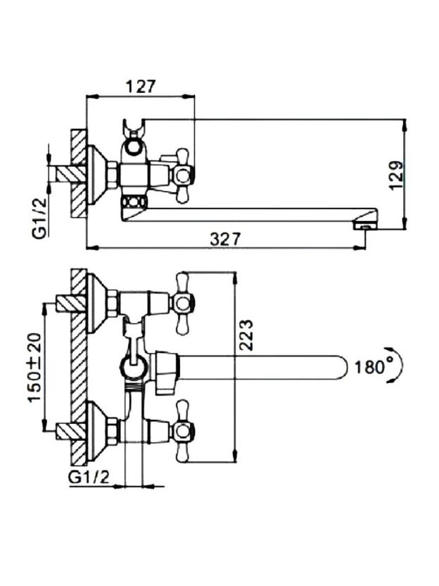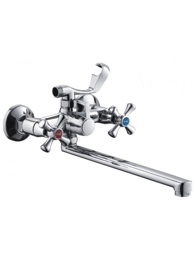 - Корпус из силумина с глянцевым хромом, длинный поворотный излив 30 см, межосевое расстояние 150 мм — подходит для стандартных ванн