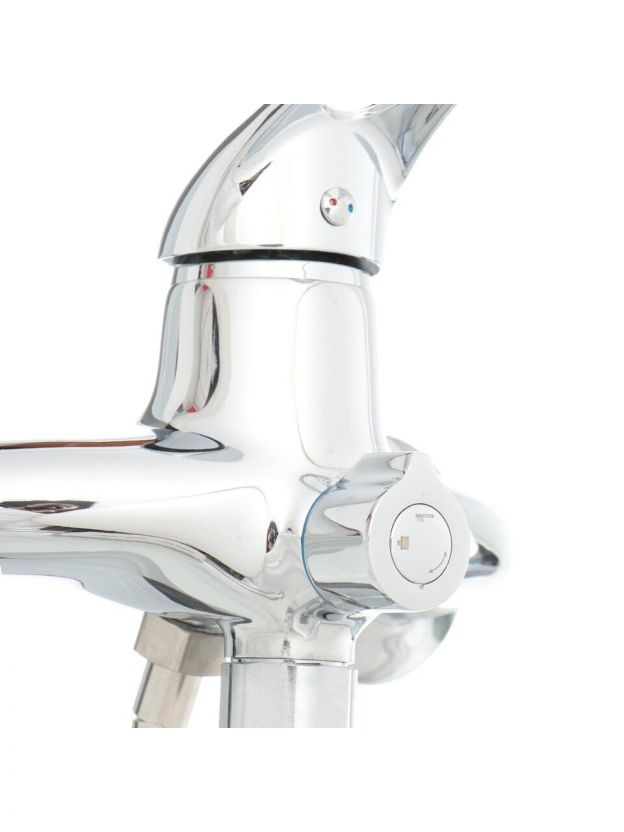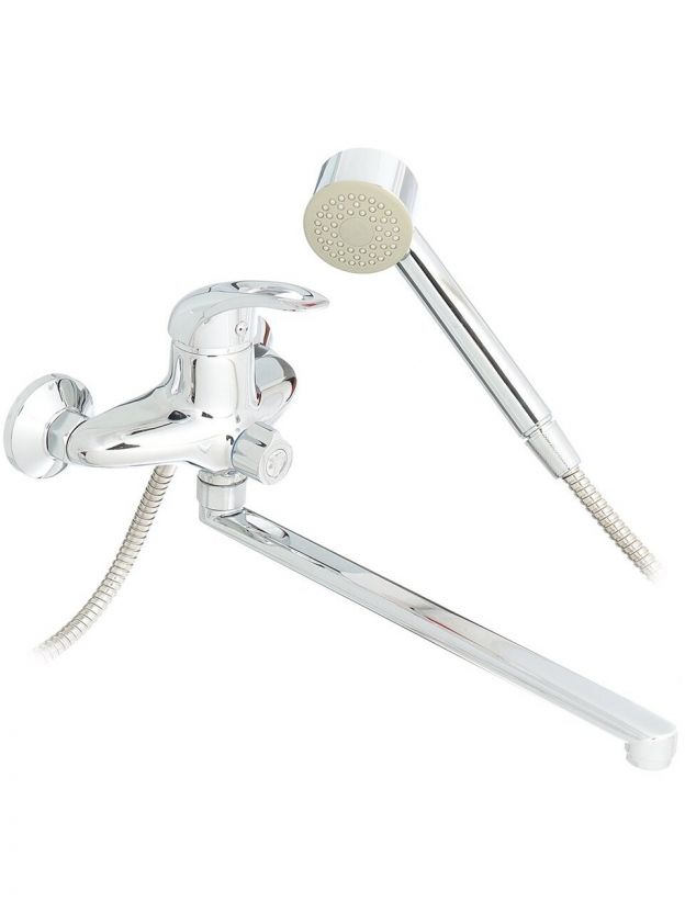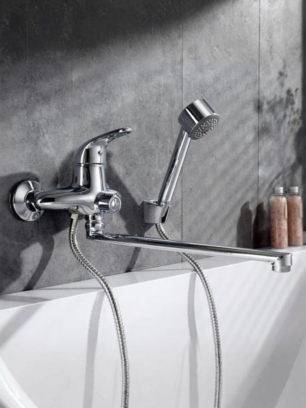 Длина излива — 32 см (длинный), что удобно для стандартных ванн и позволяет использовать смеситель как для ванны, так и для душа благодаря наличию лейки в комплекте.