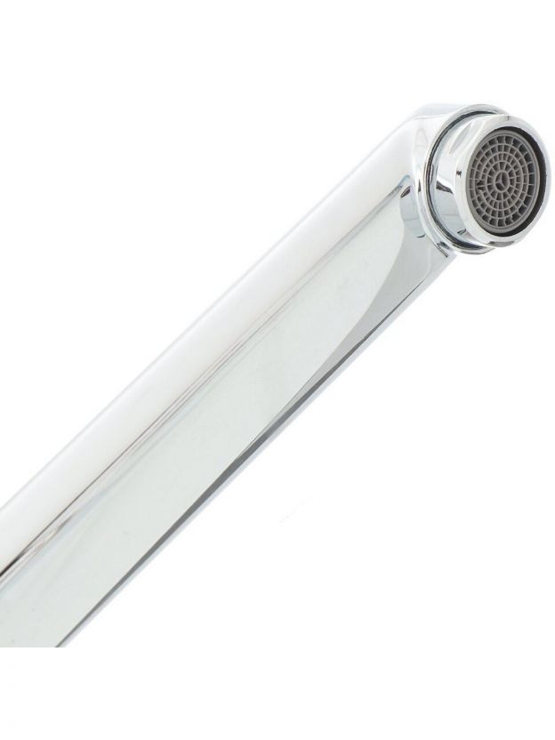 • Материал корпуса — силумин, глянцевый хром, длина излива 32 см, стандарт подводки 1/2", монтаж на 2 отверстия