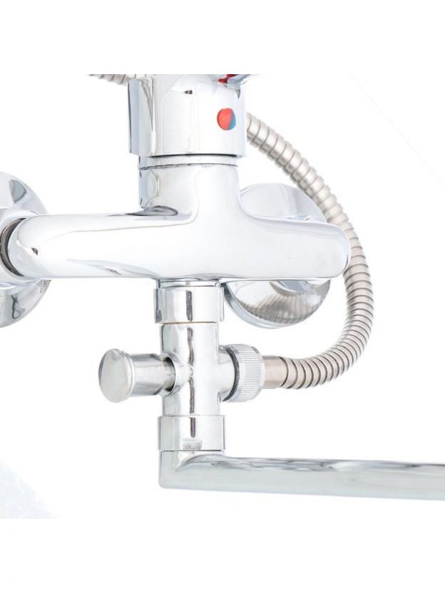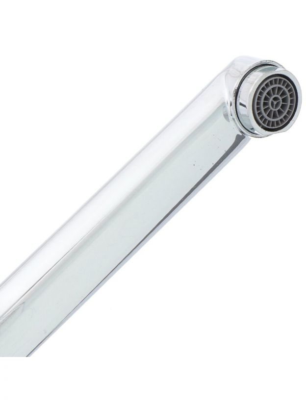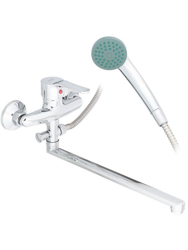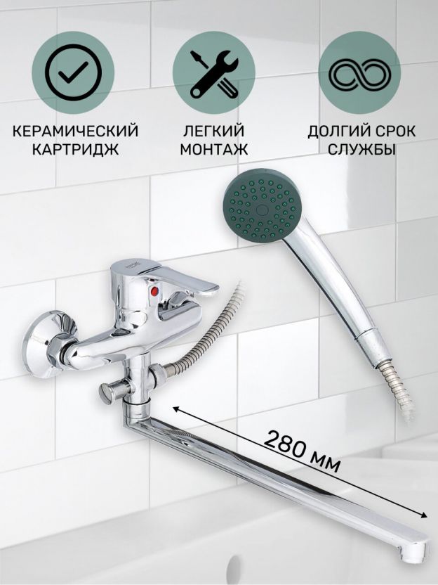 - Корпус из латуни, хромированная поверхность, длинный поворотный излив 28 см — прочность, защита от коррозии и удобство для ванны и душа