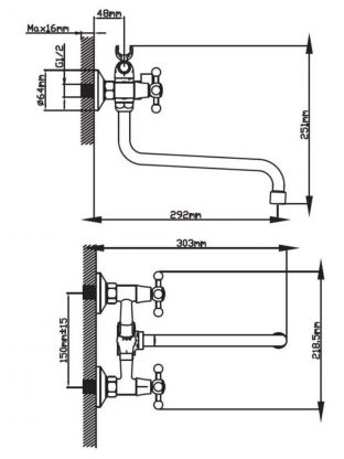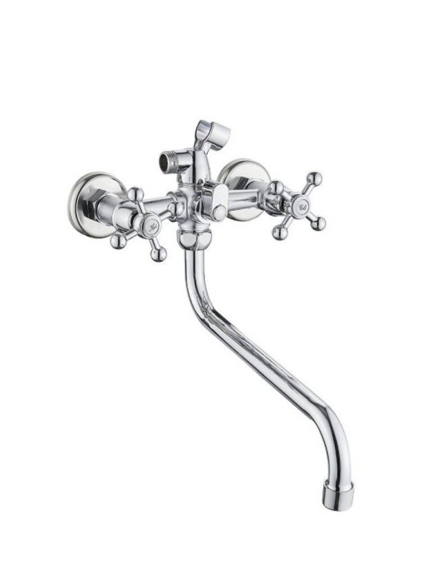Длинный поворотный излив — 24,5 см, крепление — эксцентриками на два отверстия с межосевым расстоянием 150 мм. Подходит для стандартных систем водоснабжения с подводкой 1/2".