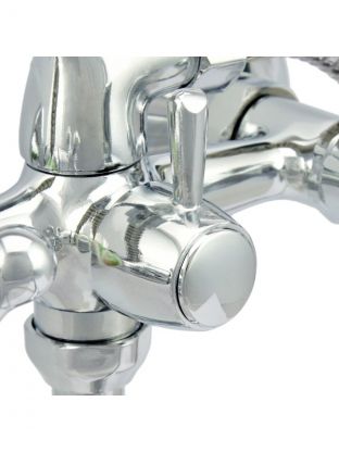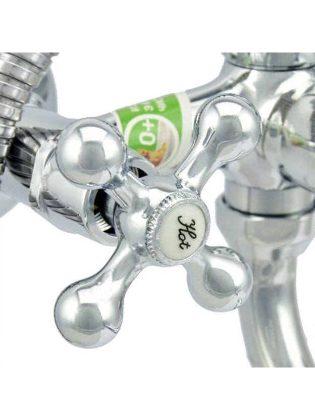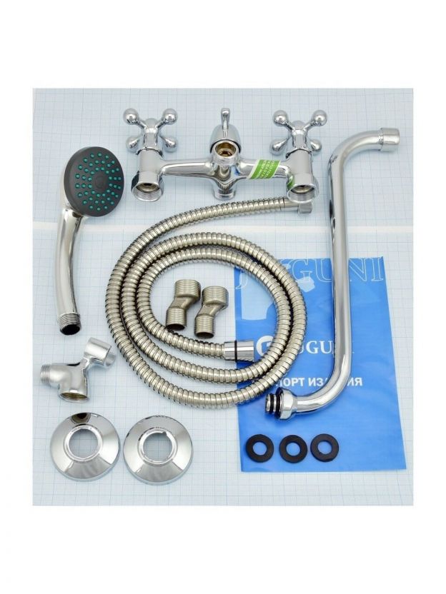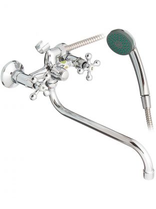 - Двухвентильное управление и длинный поворотный излив — удобно для наполнения ванны и мытья душем