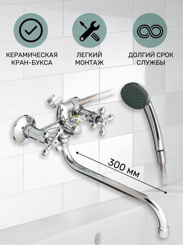 Длина поворотного излива составляет 30 см, что удобно для наполнения ванны и использования душа. Межосевое расстояние для монтажа — 150 мм.
