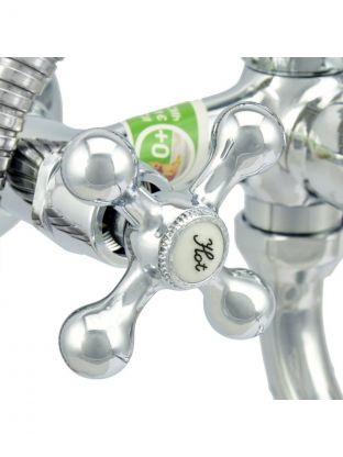 Смеситель оснащён двухвентильным управлением с керамическими кран-буксами, что обеспечивает плавную и долговечную регулировку подачи воды.
