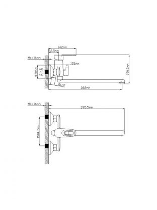 Смеситель устанавливается вертикально на стену, крепится через 2 монтажных отверстия с помощью эксцентриков. Межосевое расстояние — 150 мм, стандарт подводки шланга — 1/2".