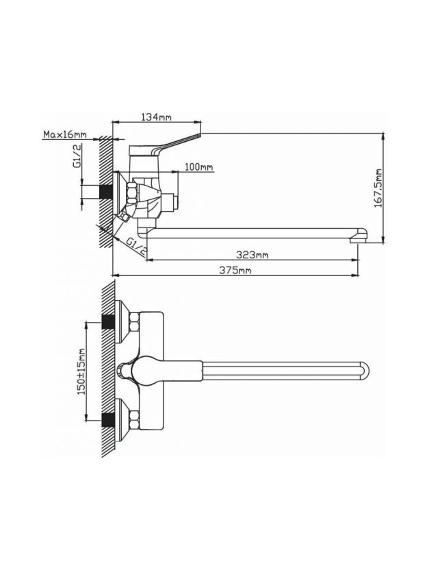 Установка проста: вертикальный настенный монтаж на 2 отверстия (межосевое расстояние 150 мм), стандарт подводки 1/2". В комплекте — лейка, аэратор и эксцентрики для надежного крепления. Благодаря универсальной конструкции, смеситель подойдет для большинства современных ванных комнат.