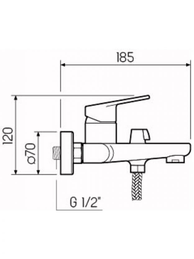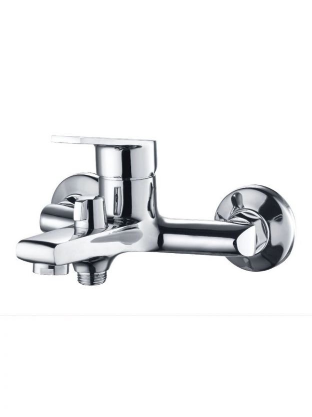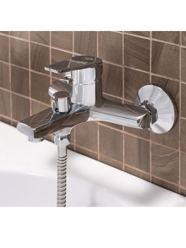 Длина короткого излива — 18,5 см, межосевое расстояние — 150 мм. Модель подходит для большинства стандартных ванн и душевых с настенным монтажом.