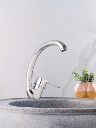 Длина поворотного излива — 37 см, корпус выполнен из цинкового сплава с глянцевым хромированием для защиты от влаги и царапин.