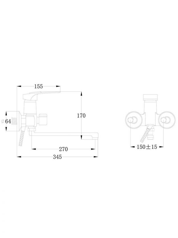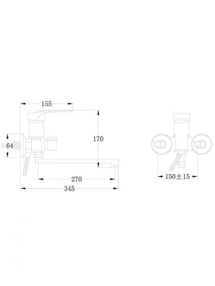 Длина излива — 30 см, межосевое расстояние для монтажа — 150 мм, крепление — на 2 отверстия с эксцентриками. Монтаж вертикальный, настенный, стандарт подводки шланга — 1/2".