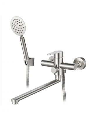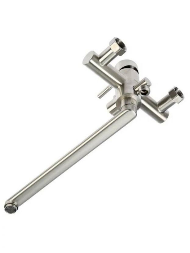 Смеситель для ванны РМС SUS124-006EP: долговечная нержавеющая сталь, плавный рычажный контроль, длинный поворотный излив 35 см для максимального комфорта.