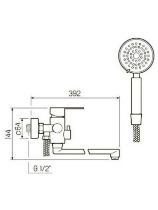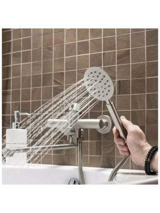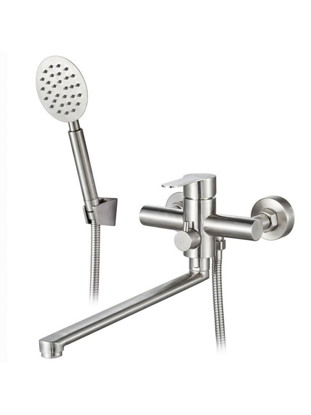 - Длинный поворотный излив 35 см и межосевое расстояние 150 мм — удобно для стандартных ванн и душевых, монтаж на 2 отверстия.