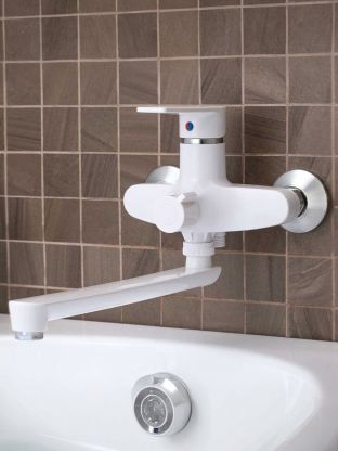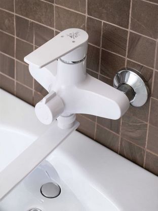 Смеситель для ванны РМС PL6-006E: стильный белый корпус из ABS-пластика, долговечный керамический картридж и длинный излив 32 см — оптимальное решение для практичного интерьера.
