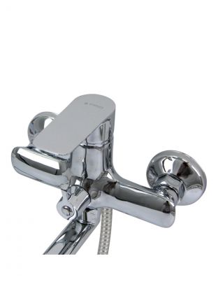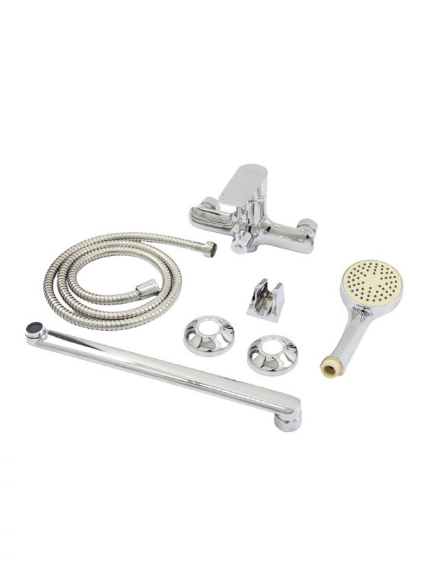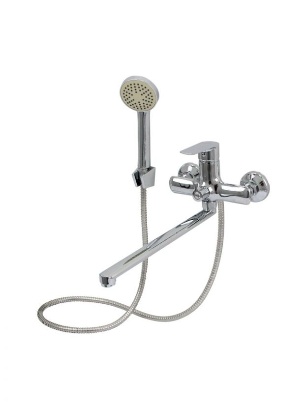 Корпус выполнен из цинкового сплава с матовым хромом, внутри — керамический картридж 35 мм, в комплекте — металлический шланг 150 см, прочная лейка, крепёжные элементы.