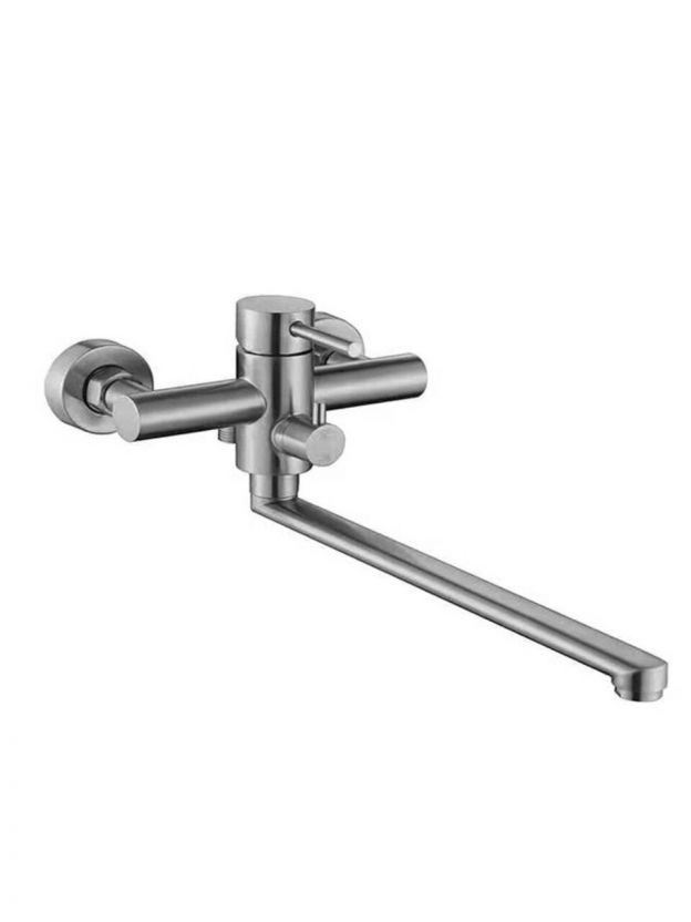 Смеситель для ванны Stemix SUS 800-006E — долговечная нержавеющая сталь, длинный поворотный излив 35 см, гарантия 5 лет. Идеальное решение для современной ванной.