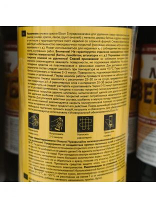Смывка наносится ровным слоем и выдерживается на поверхности до растрескивания и вспучивания лакокрасочного покрытия, которое затем легко удаляется с помощью шпателя, деревянного скребка или жесткой щетки. Elcon позволяет снять при однократном применении старой эмали. После завершения работ поверхность необходимо промыть водой, органическим растворителем или техническим моющим средством, в зависимости от последующих операций.