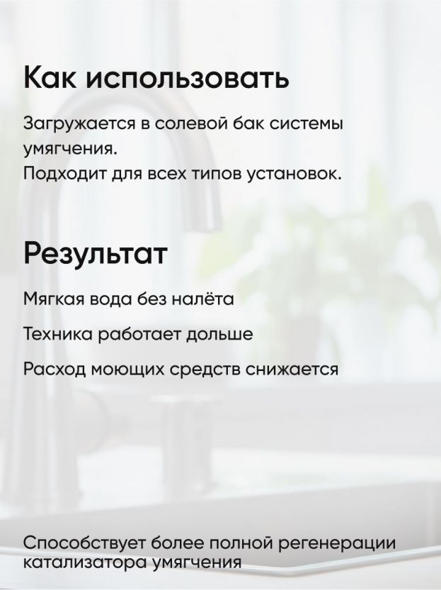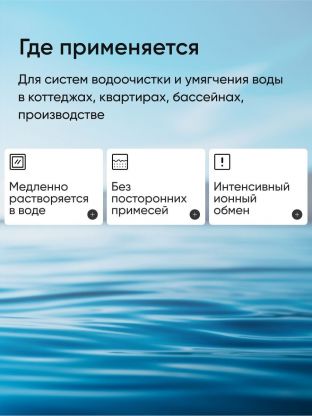 Благодаря особому способу очистки, соль Аквафор не содержит посторонних примесей, способных повредить внутренние части умягчителя. Гранулы соли Аквафор растворяются в воде медленно, постепенно, что позволяет более экономно расходовать воду и действующие вещества.