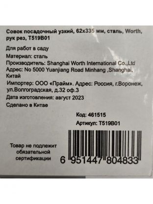 Совок посадочный узкий, 62х335 мм, сталь, рукоятка резина, Worth, T519B01