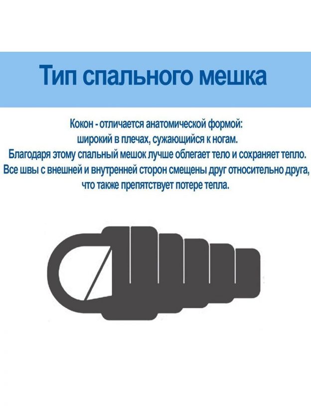 Кокон - отличается анатомической формой: широкий в плечах, сужающийся к ногам. Благодаря этому спальный мешок лучше облегает тело и сохраняет тепло. Все швы с внешней и внутренней сторон смещены друг относительно друга, что также препятствует потере тепла. Спальный мешок упакован в сумку для переноски. Габариты сумки (ДхВ): 33х15 см.