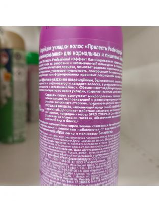 Спрей для укладки волос Эффект ламинирования от Прелесть Professional придает гладкость и здоровый блеск волосам до 24 часов. Эффект прямых волос и блеск! Спрей защищает от теплового воздействия. Идеален при применении утюжка для разглаживания волос. 100% контроль над укладкой при любых погодных условиях. 100% контроль над пушением – снимает статическое электричество. Не склеивает пряди и не оставляет липких следов на волосах. Благодаря обновленной формуле с марокканским аргановым маслом и микропротеинами пшеницы укрепляет и восстанавливает волосы изнутри, снижает ломкость волос. В состав всех средств для укладки волос Прелесть Professional включен комплекс DiProFactor, который сочетает в себе современные фиксирующие компоненты и витамины, благодаря чему обеспечивается двойной усиленный эффект – длительная естественная фиксация без склеивания волос и защита прически в любых климатических условиях. Способ применения: Перед употреблением встряхнуть. Равномерно нанести спрей с расстояния примерно 20 см на влажные волосы. Расчесать волосы и сделать укладку. Не смывать.