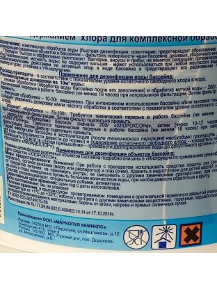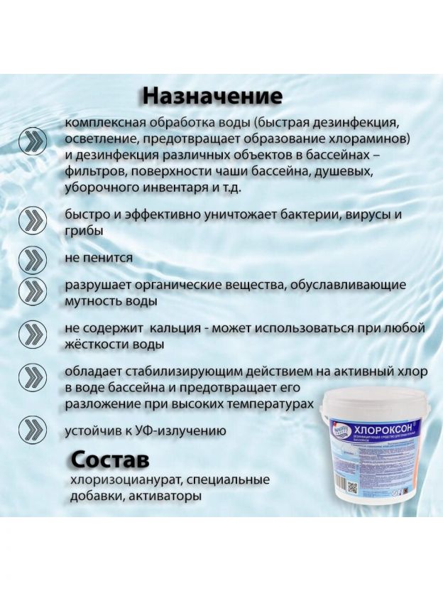 Ищете эффективное средство для поддержания чистоты и безопасности воды в бассейне? Представляем гранулы для дезинфекции и осветления воды Маркопул Кемиклс, Хлороксон. Этот продукт - идеальное решение для тех, кто заботится о здоровье и комфорте во время водных процедур. Химия для воды бассейна, которая уничтожает бактерии, вирусы и грибы, обеспечивая комплексную обработку воды. С Хлороксоном бассейн всегда будет сиять чистотой, а вода останется кристально прозрачной.