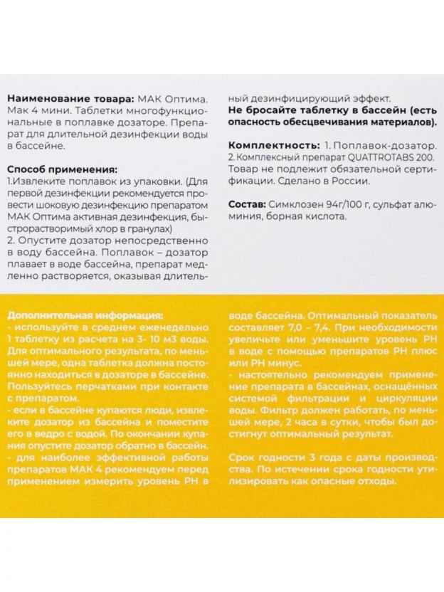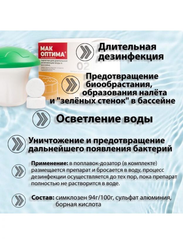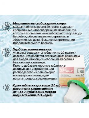 Средство MAK 4 mini, выпускается в форме таблеток и поставляется в удобном диффузоре, что значительно упрощает процесс его использования. Каждая таблетка весом 20 г рассчитана на 1-5 кубических метра воды и содержит стабилизированный хлор, который эффективно уничтожает бактерии и предотвращает их повторное появление. Это средство не только дезинфицирует, но и осветляет воду, улучшая ее качество уже после первого применения.