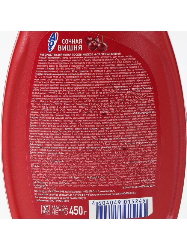 Средство для мытья посуды AOS, Сочная вишня, 450 мл