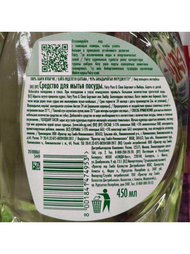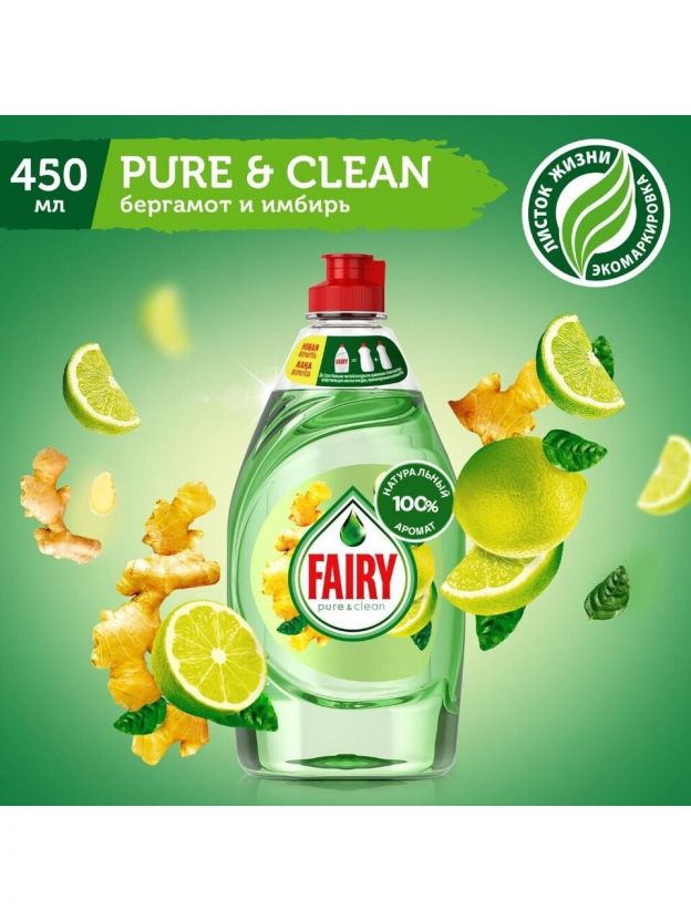 Средство для мытья посуды Fairy, Pure & Clean Бергамот и Имбирь, 450 мл