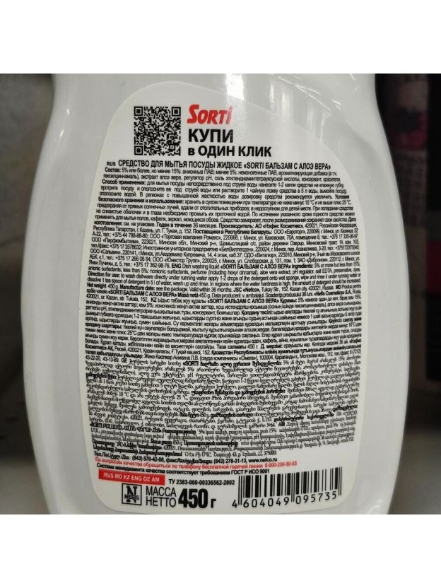 Средство для мытья посуды Sorti, Бальзам с алое вера, 450 мл