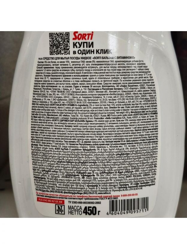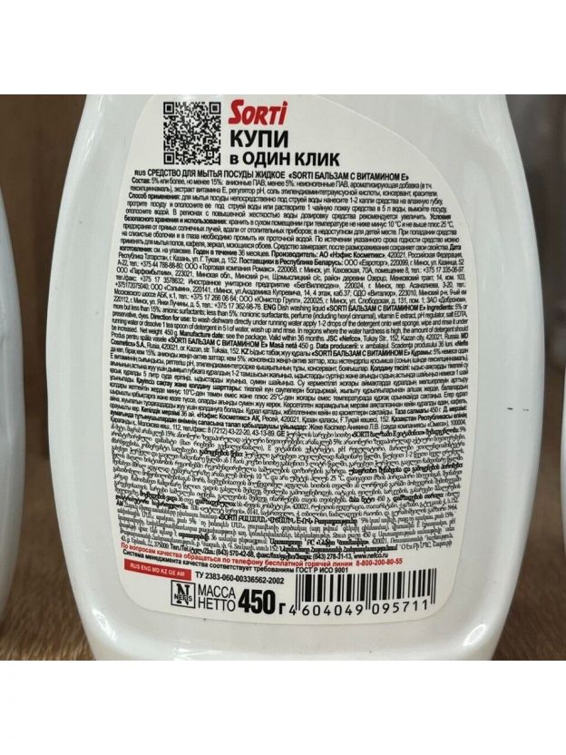Средство для мытья посуды Sorti, Бальзам с витамином Е, 450 мл