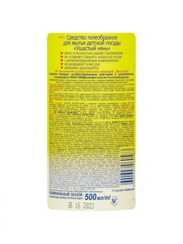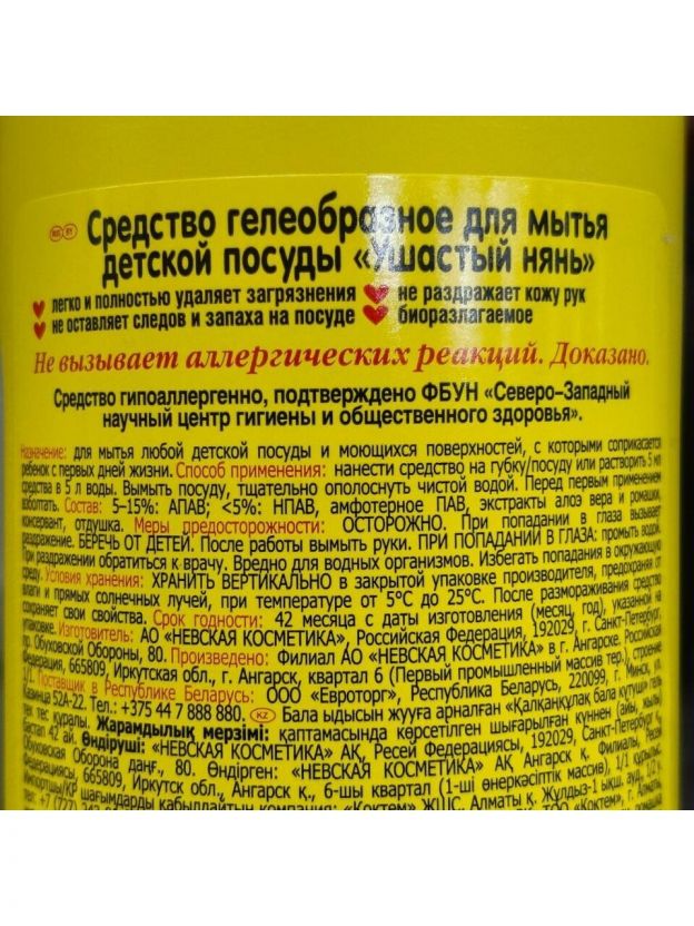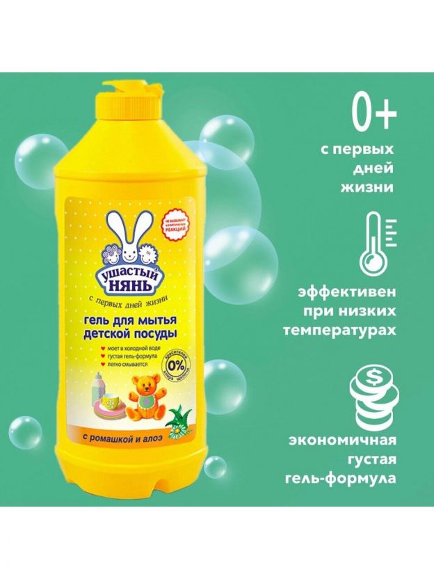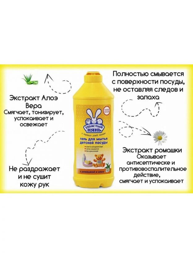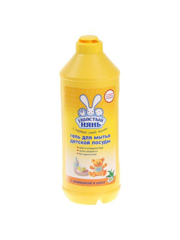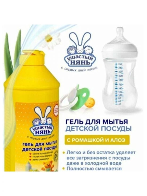 Гель для мытья детской посуды "Ушастый нянь" с экстрактом ромашки и алоэ, предназначен для мытья детской посуды, бутылочек из стекла и пластика, сосок из латекса и силикона, игрушек, а также мытья любых поверхностей, с которыми соприкасается ребенок с первых дней жизни. Легко и без остатка удаляет все загрязнения с посуды , даже в холодной воде. Легко смывается водой, не оставляя на посуде следов и запаха, позволяя не опасаться, что остатки геля попадут в пищу. Обладает антибактериальным эффектом. Не раздражает и не сушит кожу рук даже при частом использовании. Не содержит синтетических красителей и имеет очень легкий аромат.