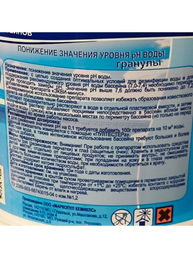 Покупка средства для понижения pH в бассейне Маркопул Кемиклс Экви-Минус обеспечит чистоту и комфорт вашего бассейна, минимизируя затраты на обслуживание. Заботьтесь о здоровье и безопасности, поддерживая идеальный уровень pH воды для приятного и безопасного купания. Это надежное средство станет вашим помощником в создании кристально чистой воды в бассейне, что позволит наслаждаться плаванием без лишних забот.