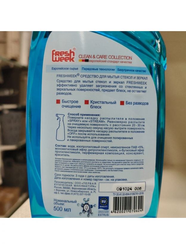 Средство для мытья стекол и зеркал FreshWeek эффективно удаляет загрязнения со стеклянных и зеркальных поверхностей, придает блеск, не оставляет разводов. Состав: вода, изопропиловый спирт, неионогенное ПАВ