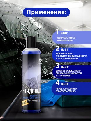 Антидождь создает водоотталкивающую пленку, предотвращая появление разводов, облегчая уборку и сохраняя чистоту даже при высокой влажности или осадках.