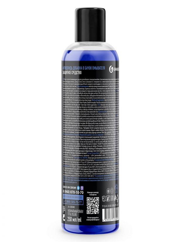 Способ применения: Взболтать флакон перед применением. В отдельной таре разбавить 1/3 содержимой жидкости средства с 5 литрами воды, при температуре окружающей среды ниже 0°, возможно разбавление с незамерзающей жидкостью Grass. Тщательно взболтать. Получившийся состав залить в бачок стеклоомывающей жидкости.