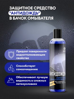 Средство для стекол и зеркал Grass Антидождь 250 мл (артикул 800-440) — современное решение для защиты стеклянных и зеркальных поверхностей от осадков, пыли и загрязнений. Благодаря инновационной формуле с гидрофобными компонентами средство создает невидимую пленку, которая отталкивает воду и облегчает последующую уборку. Часто спрашивают, как использовать антидождь: просто нанесите состав на чистую поверхность, равномерно распределите и дайте высохнуть — эффект длится до месяца даже при частых дождях или мойке.