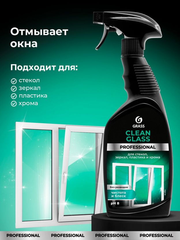 Grass Clean специально создан для стеклянных и зеркальных поверхностей: не оставляет разводов, быстро испаряется, подходит для ежедневного применения.