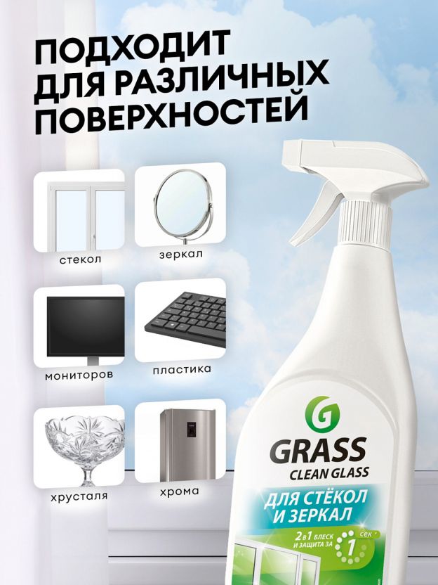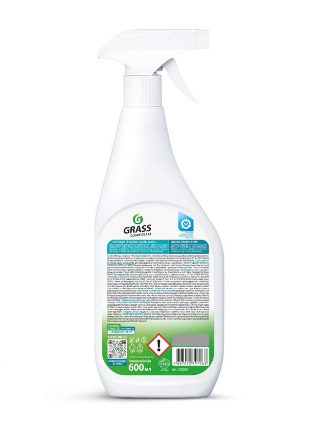 Спрей для стекол Grass Clean – это универсальное чистящее средство для окон, стекол и пластика. Не оставляет подтеков, разводов, экономичен в применении. Придает поверхностям антистатические свойства. Может применяться в офисе для чистки мебели, мониторов, стекол, зеркал, торгового оборудования. Готов к применению. Со средством Clean Glass мытье окон в вашем доме станет проще. Способ применения: распылите средство на обрабатываемую поверхность с расстояния 15-20 см. Протрите до полного высыхания сухой бумажной салфеткой или тканью, не оставляющей волокон. Характеристики: Средство: спрей. Особенности: антибактериальное, безопасно для животных, биоразлагаемое, гипоаллергенное, можно использовать без перчаток, не требует смывания, подходит для чувствительной кожи. Эффект: придание блеска, с антистатиком. Не содержит: аммиак, анионные ПАВ, искусственные красители, нефтепродукты, парабены, формальдегид, фосфаты, хлор. Уровень pH: 8.00. Состав: _30% очищенная вода; Преимущества: Экономичный расход. Не оставляет разводов и царапин. Подходит для разных типов поверхностей: стекло, зеркало, пластик, экран монитора. Средство имеет эффект антистатика.