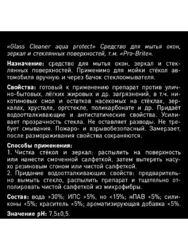 Средство для мытья стекол и зеркал Pro-Brite Glass cleaner 500 мл — идеальное решение для быстрой и эффективной уборки дома. Прозрачные поверхности сияют чистотой без разводов, а удобный объем 500 мл подходит для регулярного применения. Стекла и зеркала легко возвращают блеск, а уборка становится проще и приятнее.