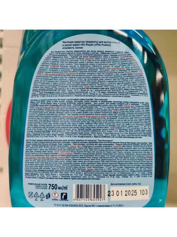 Средство "Rio Royal" предназначено для мытья стекол, зеркал и других изделий из стекла;