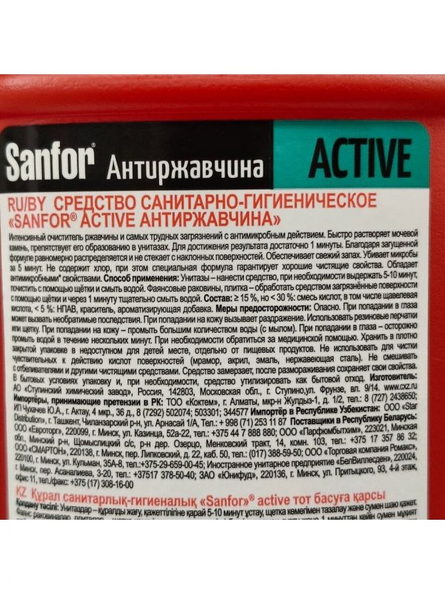 Sanfor — одного из крупнейших производителей бытовой химии на территории Российской Федерации. Приверженность самым высоким стандартам качества, использование передовых технологий, эффективность и доступная цена по праву делают Sanfor популярным у потребителей. Характеристики: Назначение: чистка поверхностей; Объем: 750 мл; Страна происхождения: Россия. Преимущества: Sanfor получило российский знак качества, подтверждающий его высокое качество и безопасность; Sanfor эффективно удаляет ржавчину и другие сложные загрязнения в ванной комнате и туалете; Улучшенная формула позволяет достигать идеального результата без длительного выдерживания. Способ применения: Обработать средством загрязненную поверхность Выдержать 1-2 минуты Почистить щеткой и смыть водой. НЕ ИСПОЛЬЗОВАТЬ для чистки поверхностей из мрамора, акрила, эмали, хрома, нержавеющей стали и латуни.