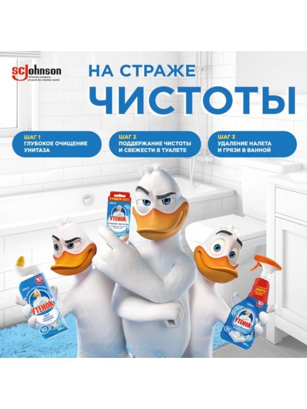 Средство для сантехники Туалетный утенок обладает выраженным антибактериальным эффектом (убивает 99% известных микробов) и предназначено для эффективного удаления ржавчины, известкового налета, биозагрязнений с фарфоровых, фаянсовых и керамических поверхностей. Средство прошло обязательную сертификацию на экологическую безопасность, не содержит хлора, не раздражает кожу рук. При регулярном применении эффективно против обширных застарелых загрязнений. Объем 900 мл.