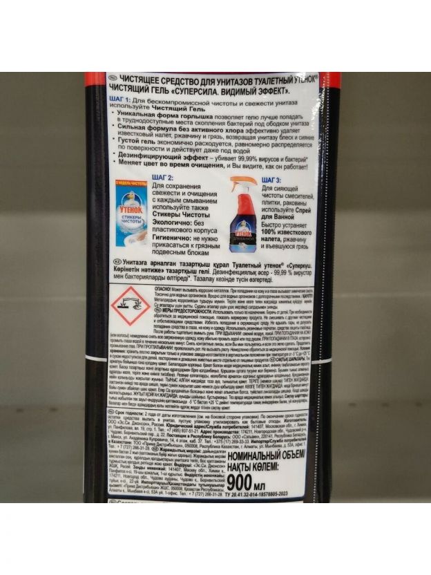 Чистящее средство для унитазов "Видимый эффект" - это быстрый способ избавиться от известкового налета, мочевого камня и других загрязнений в санузле. Средство с удобным распределителем позволяет экономно расходовать продукт. Необходимо нанести небольшое количество жидкости на унитаз и выдержать в течение нескольких минут. Смыть при помощи губки или тряпки. Состав придает естественный блеск и предотвращает появление образований. Состав: вода, кислота соляная более 5%, но менее 15%, менее 5% н-ПАВ, отдушка, менее 5% красителей. Удаляет самые стойкие пятна и до 100% известкового налета. Меняет цвет во время очищения. Эффективен даже под водой. Убивает 99,9% микробов. Используйте туалетный утенок диски чистоты для сохранения свежести и очищения с каждым смыванием. При попадании в глаза вызывает необратимые последствия. При попадании на кожу вызывает раздражение. Вредно при проглатывании. Способ применения: Надавив на метки, открутите колпачок Поднимите сидение унитаза Нанесите средство под ободок унитаза по окружности Для максимального результата: после нанесения средства используйте ершик для очистки поверхностей над и под водой -Для удаления загрязнений в нижней части унитаза налейте средство в воду и оставьте на 60 минут, смойте Плотно закрутите колпачок Используйте регулярно для поддержания чистоты и свежести в туалете.