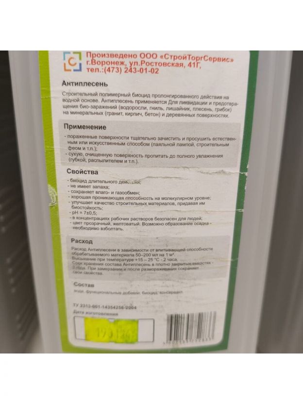 Антиплесень - это строительный полимерный биоцид пролонгированного действия на водной основе. Применяется для ликвидации и предотвращения биозаражений (водоросли, гниль, лишайник, плесень, грибок) на минеральных (гранит, кирпич, бетон) и деревянных поверхностях.