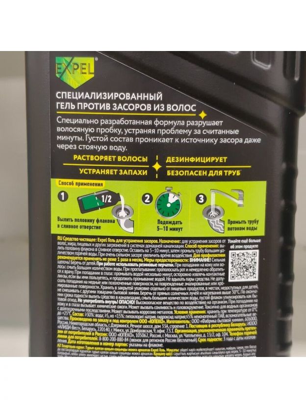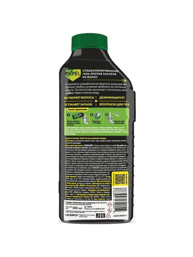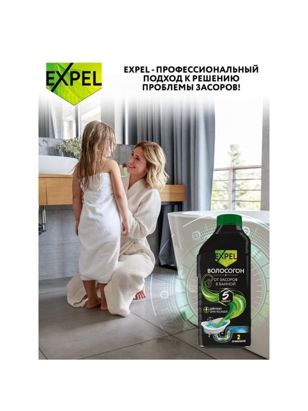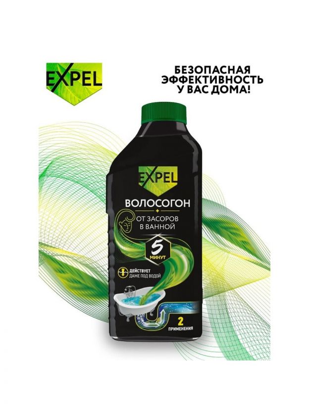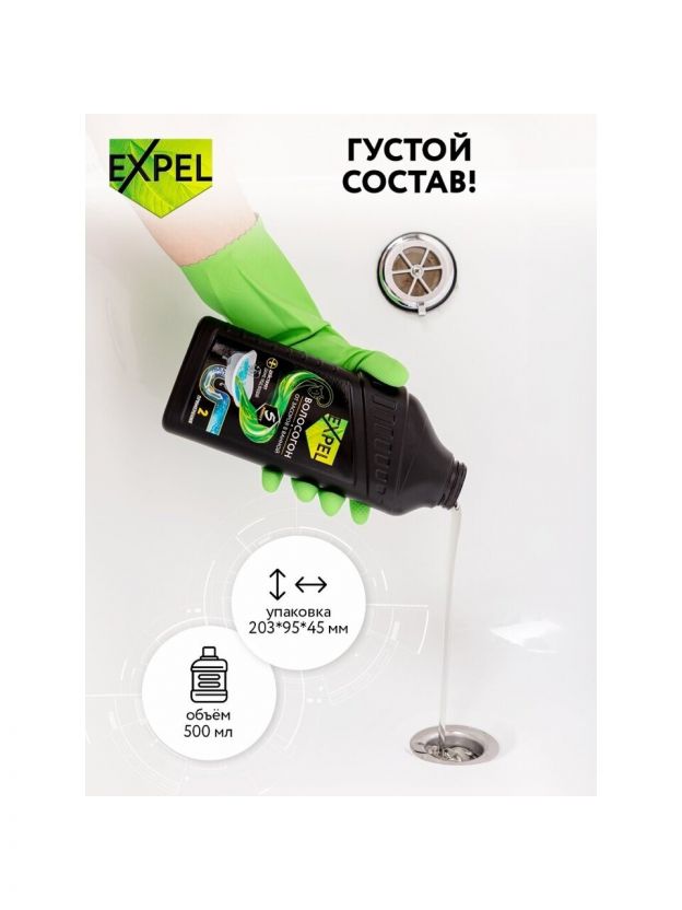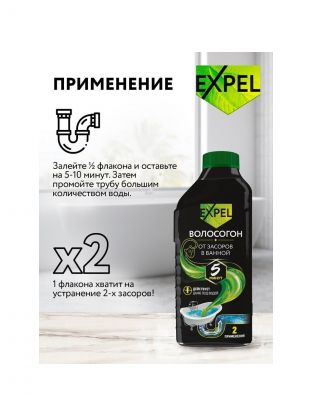 Гель для устранения засоров от волос Expel подходит для всех видов металлических и пластиковых труб.