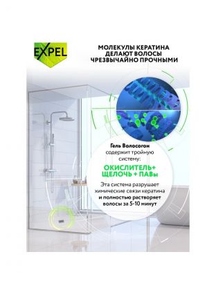 Гель разрушает структуру кератина, из которого состоят волосы, за счет чего устраняет сложные засоры за 5-10 минут.