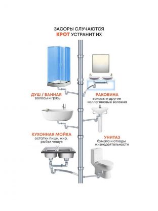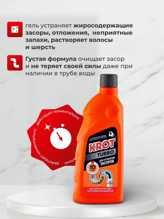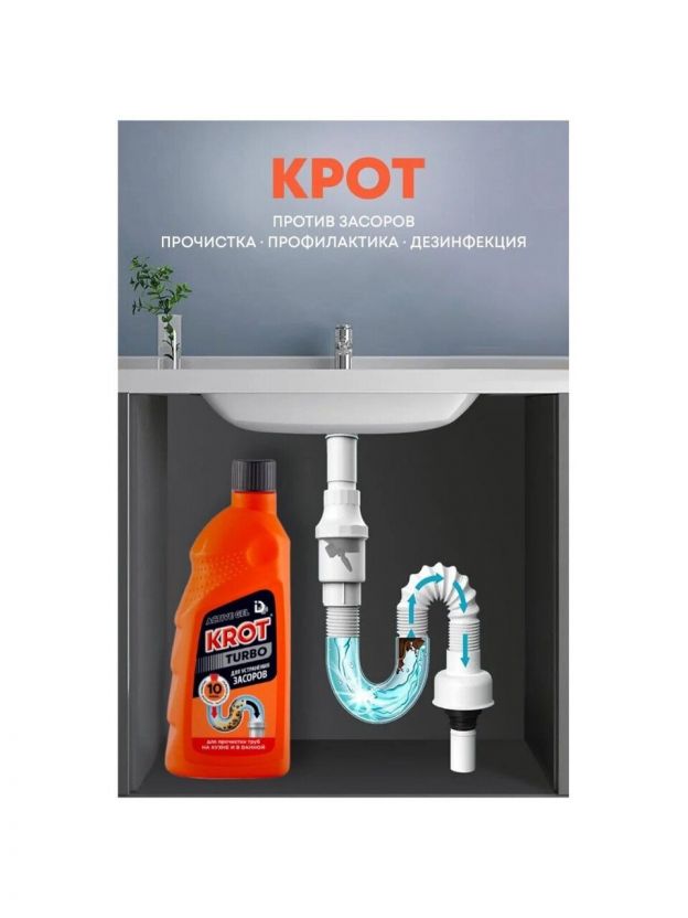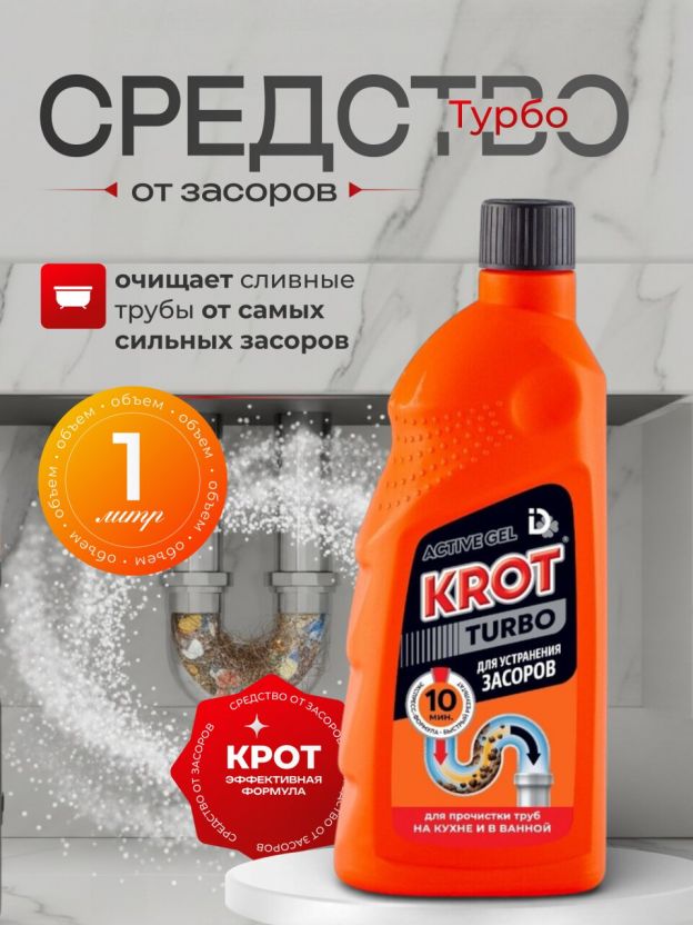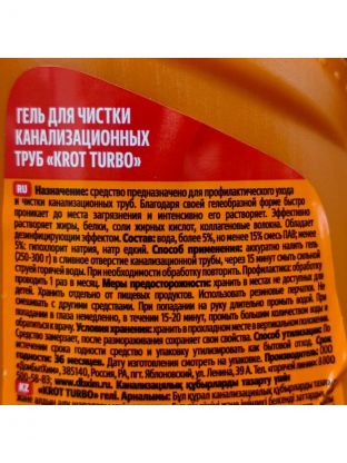 Благодаря гелеобразной консистенции и высокому содержанию активных веществ гель Крот Турбо быстро проникает к месту загрязнения и интенсивно его растворяет. Эффективно удаляет из сливных труб коллагеновые волокна, волосы, рыбью чешую, остатки пищи, жир и грязь. Дезинфицирует, устраняет неприятные запахи. Характеристики: Тип: средство от засоров. Назначение: для прочистки труб. Объем, мл: 1000. Форма выпуска средства: гель. Особенности: концентрат, антибактериальный. Эффект: устранение засоров и неприятных запахов. Преимущества: Подходит для всех видов труб, в том числе и пластиковых. Густая формула геля обеспечивает экономичный расход средства. Удобная упаковка с колпачком "защита от детей" обеспечивает безопасность.