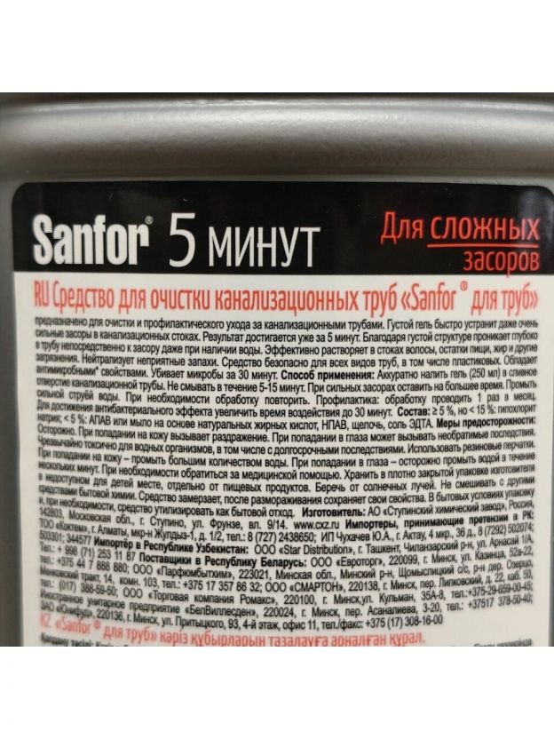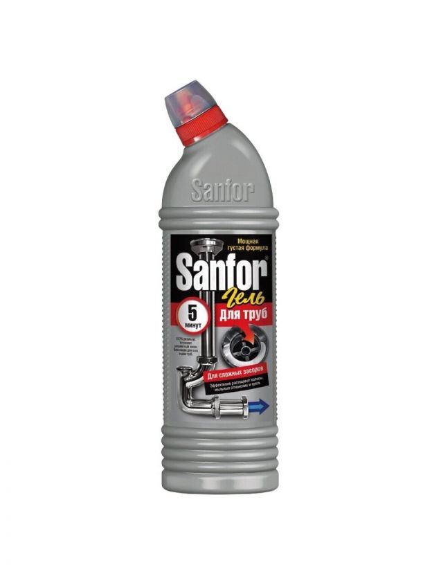 Sanfor — одного из крупнейших производителей бытовой химии на территории Российской Федерации. Приверженность самым высоким стандартам качества, использование передовых технологий, эффективность и доступная цена по праву делают Sanfor популярным у потребителей. Характеристики: Назначение: от засоров. Объем: 750 мл. Форма выпуска: гель. Преимущества: Имеет густую формулу, благодаря чему лучше проникает к месту засора, не теряя своей силы даже при наличии в трубе воды. Гель растворяет волосы, шерсть, остатки пищи, жир, грязь, мыльный налет и другие загрязнения в стоках, нейтрализует неприятные запахи. Средство безопасно для всех видов труб, в том числе пластиковых.