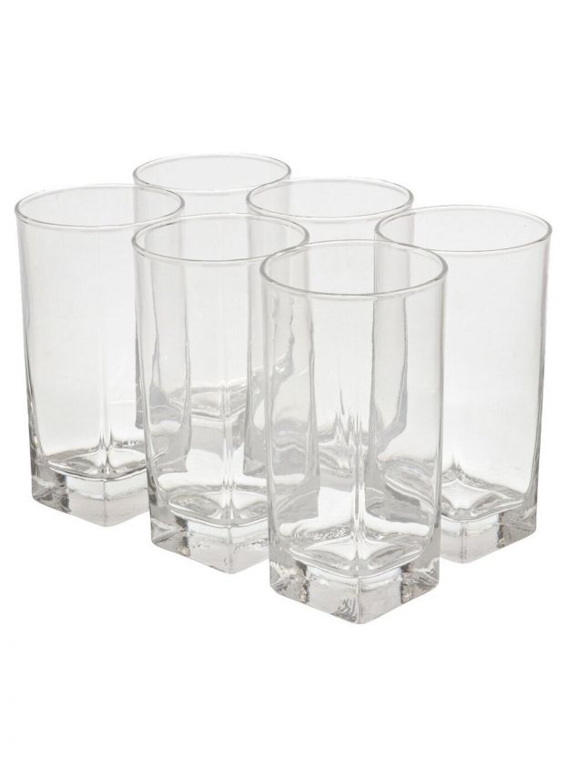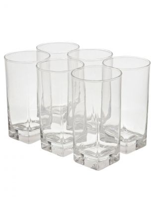 Объём каждого стакана — 305 мл (по SEO — 310 мл), форма высокая (хайбол), материал — прочное прозрачное стекло, количество в наборе — 6 штук.