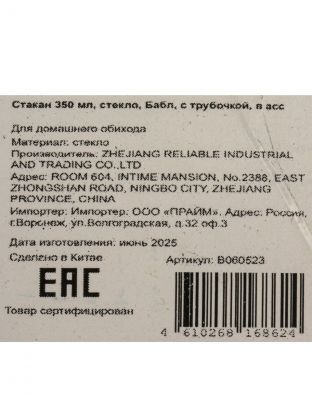 Объём стакана — 350 мл, материал — прочное стекло; в комплекте одна трубочка, количество в наборе — 1 штука.