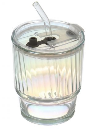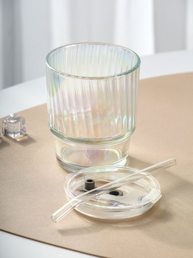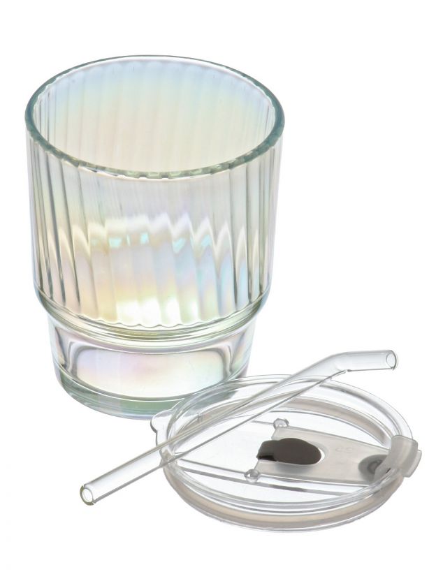 Стильный перламутровый стакан 400 мл из стекла с трубочкой и крышкой — идеальный выбор для воды, сока или лимонада дома и на даче. Удобно мыть в посудомоечной машине.
